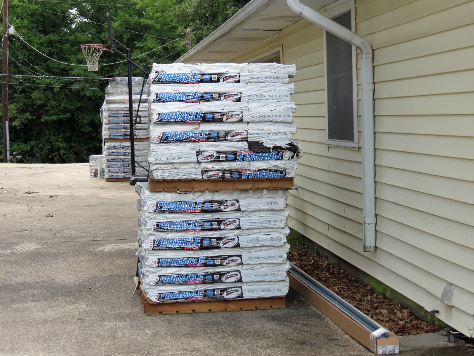 The work was supposed to begin on Monday but was postponed a day due to predicted storms that never happened. Materials were delivered early Monday anyway. They arrived on a truck so big it had to park on our narrow, two-lane road, blocking one lane of traffic, while the driver loaded everything onto a forklift and rode that up our hilly driveway to unload everything, which took several trips.